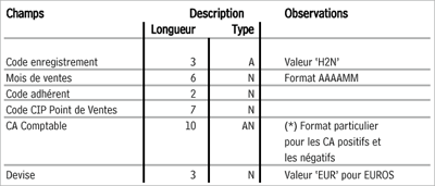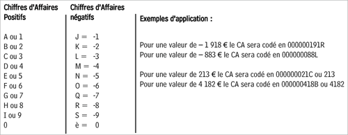 Fichier CA comptables par établissement Il n'y a pas de caractère séparateur entre chaque champ. (*) Gestion des CA Positifs et Négatifs Les Chiffres d'Affaires sont exprimés en alphanumérique. Le dernier caractère alphabétique sert à repérer le signe :